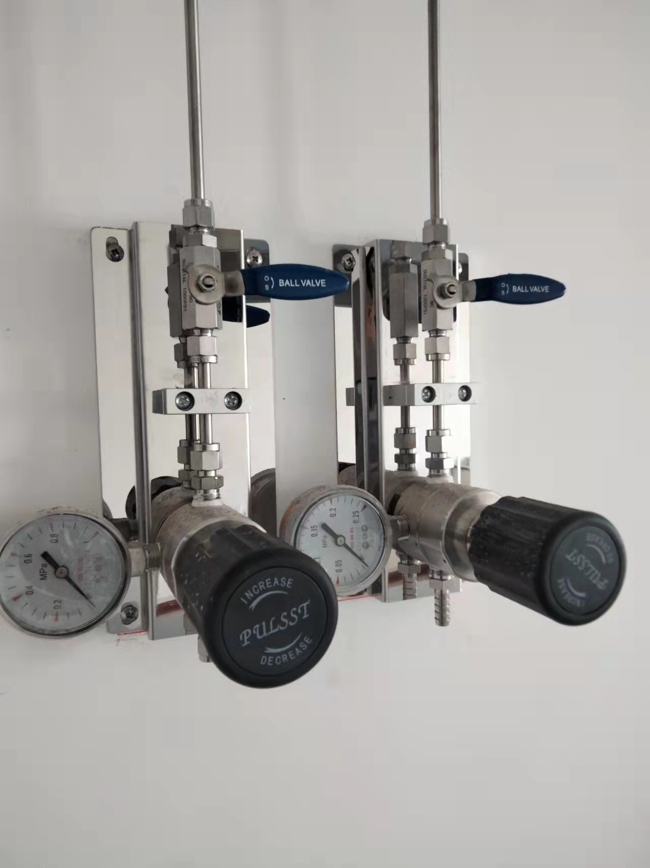 再次是解決氣瓶壓力的問題。每種氣體可以將多瓶氣體并聯然后通過一個出口統一減壓后運送氣體至使用點。因為氣瓶間是相對獨立的,整個氣路系統壓力最大的地方也是氣瓶出口處,因此這種方式將氣瓶壓力可能發生的危險縮小至氣瓶間內,可對人體及儀器的傷害可降到最低。